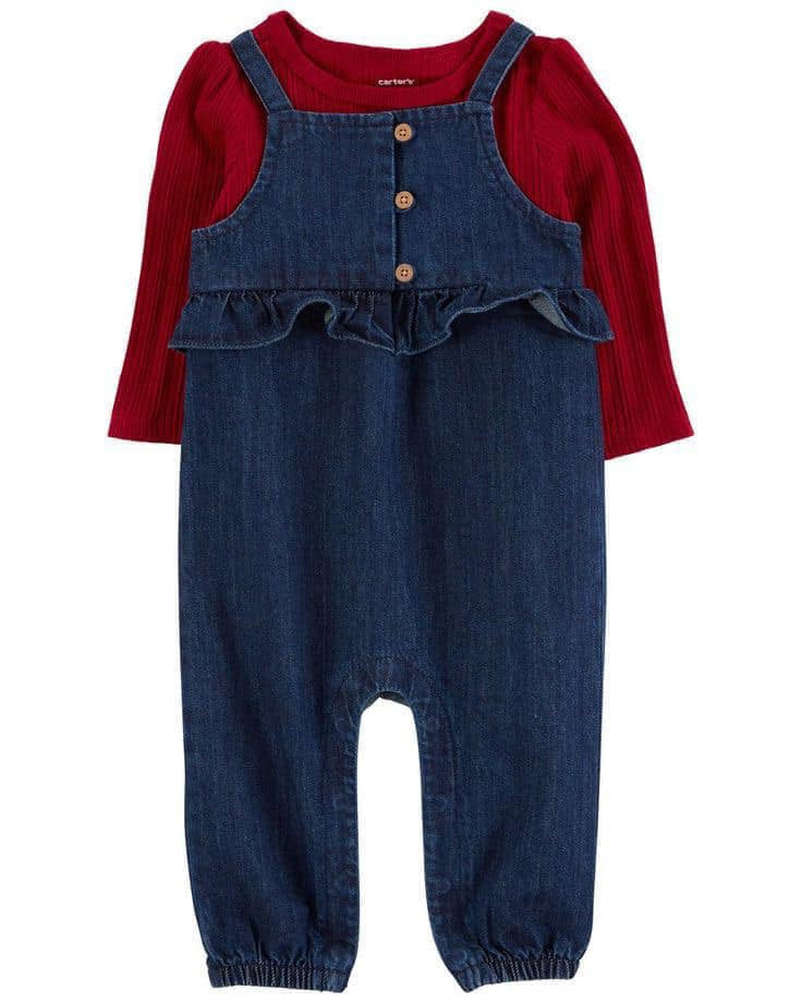 Este conjunto incluye una camiseta de manga larga para usar debajo de un mono vaquero súper mono.